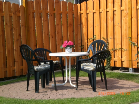 Unser Aussensitzplatz, umrahmt von einem begrünten Windschutz, lädt zum verweilen, ausspannen und grillen ein. ( Grill, Sonnenschutz und Sitzmöbel vorhanden)